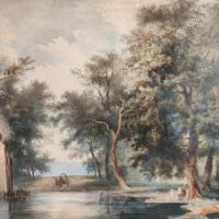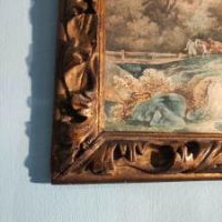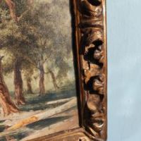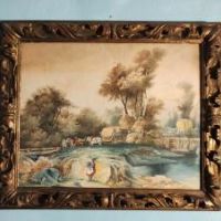 Coppia di Gouache raffiguranti paesaggi con personaggi racchiuse in belle cornici in legno dorato di epoca fine 600