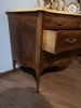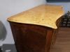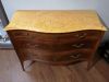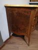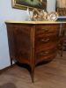 Cassettone Napoli, in noce, radica e altre essenze, fronte mosso a 3 cassetti con motivi geometrici, fianco con analogo motivo, bellissimo piano in marmo giallo di Siena, gambe mosse con piedino in bronzo.