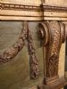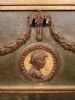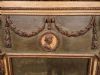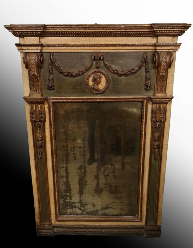 Bellissima specchiera fondo sala in legno laccato oro e verde caratterizzata nella parte centrale da grande medaglione entro festoni, mentre sui lati si stagliano festoni con motivi floreali. Dimensione: 172,5 cm x 125 cm. Epoca: fine del XVIII secolo - Primi del XIX secolo.