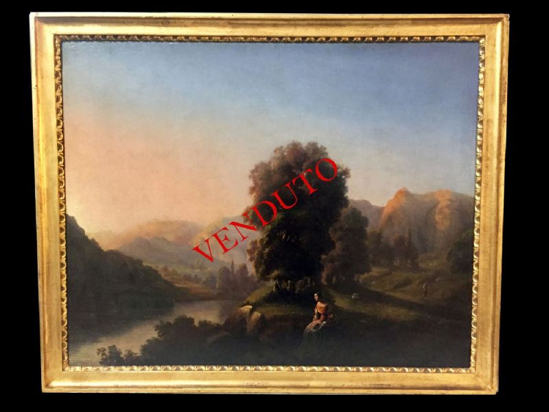 Dipinto raffigurazione di veduta della campagna romana . Il paesaggio è contraddistinto da una figura di fanciulla in primo piano e da alcuni personaggi visibili sullo sfondo , il tutto avvolto in una luce calda e delicata .