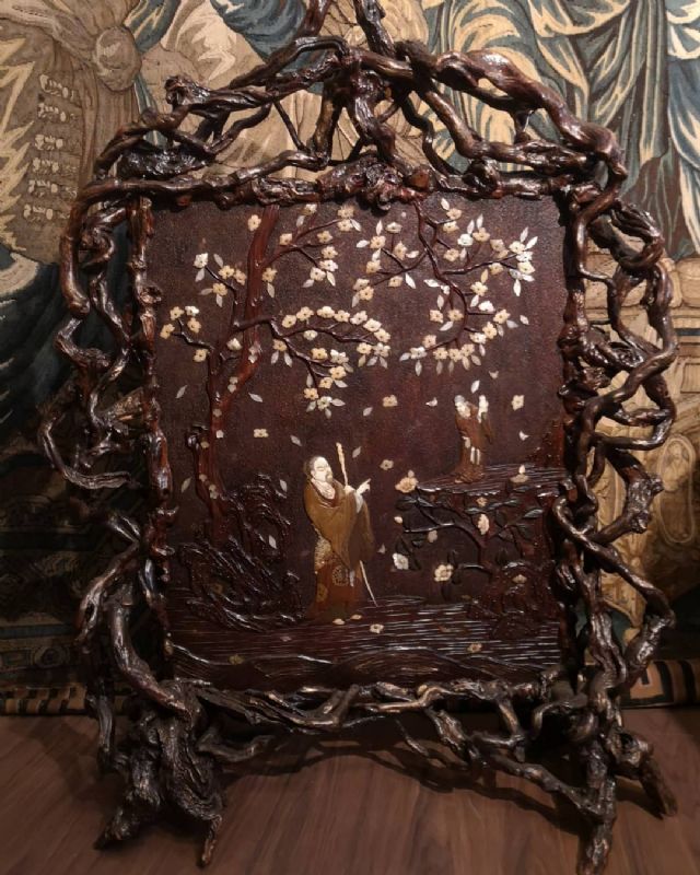 Importante Pannello Giapponese in legno, finemente intagliato con ricche applicazioni in materiale prezioso.