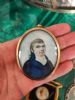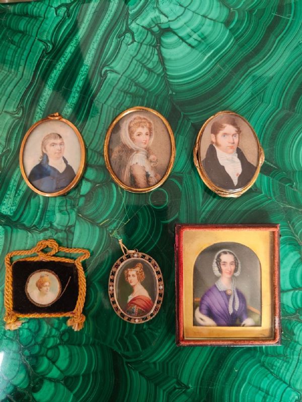 Bella serie di Miniature provenienti dalla stessa collezione, formata da due figure di gentildonna e gentiluomo, una miniatura (spilla) raffigurante gentiluomo, una piccola miniatura attaccata su seta, una miniatura entro cornice in argento e una grande miniatura entro cornice in pelle raffigurante fanciulla. Epoca dal XVIII secolo al XIX secolo. Dimensione: tre miniature sono cm 7x5,5 , una miniatura 6 x 4 cm una miniatura 8 x 9 cm con cornice ( solo miniatura 6,8 x 5,5 cm) una miniatura con seta con cornice in seta 6,5 x 6,5 cm solo miniatura 3 x 3 cm